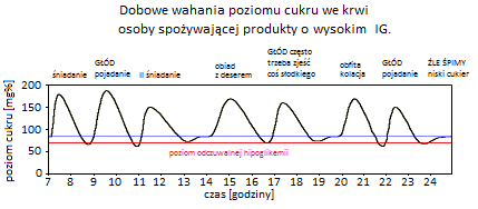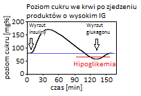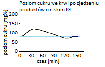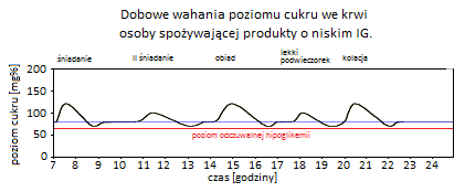 Pierwszy wykres ilustruje proces, który zachodzi po zjedzeniu produktu o niskim indeksie glikemicznym. Taki indeks powoduje powolny i spokojny, a jednocześnie niewielki wzrost poziomu glukozy we krwi. Tak dostarczonego paliwa jako źródła energii starcza na dłużej. Dłużej czujemy się syci i zadowoleni. Czerwona linia na wykresie oznacza poziom, przy którym możemy zacząć odczuwać skutki niedocukrzenia. Czyli huśtawka lekko wypchnięta do przodu wykona podobnie nieznaczny ruch w tył, nie przekraczając czerwonej linii – obszar poniżej tej linii należy do strefy hipoglikemii, czyli poziomu glukozy zbyt niskiego dla potrzeb organizmu.