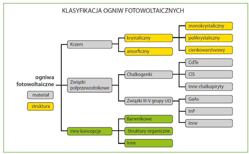 Powszechnie występuje ograniczenie dostępności najsprawniejszych wyrobów fotowoltaicznych przez przodujące kraje, np. USA. Podstawowy podział związany z użytym materiałem jest następujący: