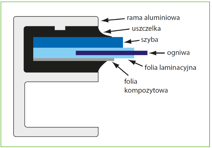 szeregowo ogniwa fotowoltaiczne umieszczone są we wspólnej ramie i przykryte szybą ochronną.