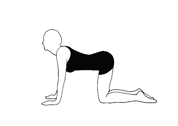 W klęku podpartym wygnij plecy do góry, w tak zwany koci grzbiet (A). Powróć do pozycji wyjściowej, a następnie wygnij kręgosłup w dół (B) i powróć do pozycji wyjściowej.