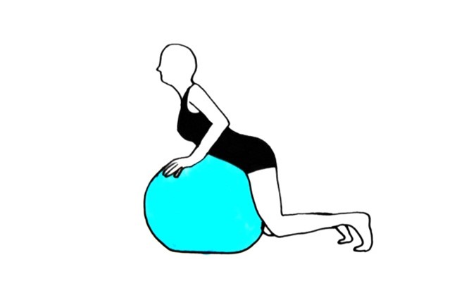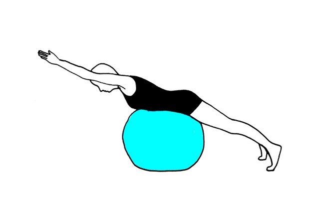 Połóż się na piłce, tak aby kręgosłup z udami tworzył kąt prosty. Całe ciało połóż na piłce i zrelaksuj się przez chwilę, wykonując wdech. Podczas wydechu unieś klatkę piersiową do góry, trzymając dłonie na piłce (A). Z wdechem wyciągnij kręgosłup, prostując ręce i nogi, tak aby całe ciało tworzyło linię prostą (B). Z kolejnym wydechem ugnij nogi i powróć do pozycji przedstawionej na rysunku A.