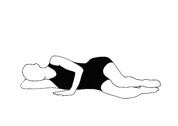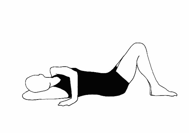 Połóż się na prawym boku, prawa noga wyprostowana, lewa zgięta w biodrze i w kolanie, prawa dłoń przytrzymuje kolano (A). Z tej pozycji lewą rękę odchyl maksymalnie do tyłu, nie zmieniając ułożenia reszty ciała (B).