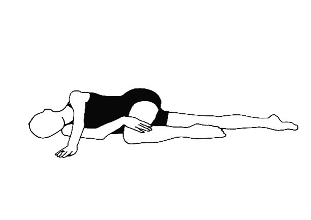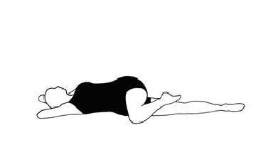 Połóż się na brzuchu, czoło oprzyj na splecionych dłoniach, nogi zgięte w kolanach (A). Z tej pozycji przenieś złączone stopy raz w prawą, raz w lewą stronę (B). Powtórz to ćwiczenie 8 razy.