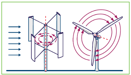 Rys. Siłownie wiatrowe o pionowej i poziomej osi obrotu.