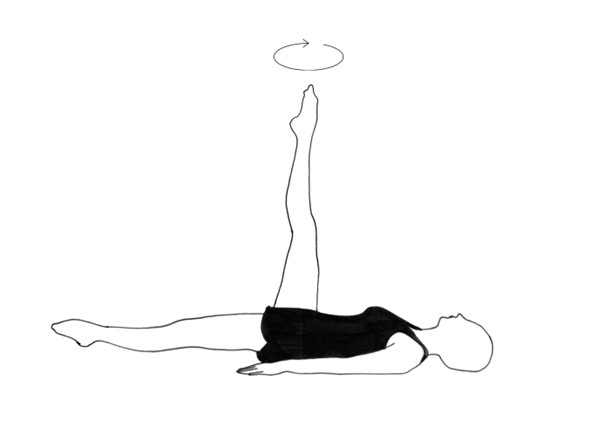 Połóż się na plecach, ręce wzdłuż tułowia, palce stóp obciągnięte. Unieś prawą nogę w górę, nie odrywając bioder od podłogi. Wyobraź sobie, że twoja stopa to wskazówka zegara ‒ wykonuj powolne krążenie prawą nogą, wdychając powietrze między godziną 12 a 6 i wydychając między 6 a 12. Po kilku powtórzeniach zrób to samo w drugą stronę, a następnie zmień nogi.