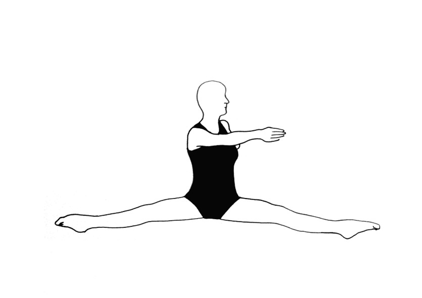 Usiądź w siadzie rozkrocznym, ciało wyprostowane, ramiona w bok. Z wydechem skręć tułów w lewą stronę (A). Kontynuując wydech, zrób skłon do lewej nogi, rozciągając ciało (B). Zrób wdech i powróć do pozycji wyjściowej. To samo zrób w drugą stronę.