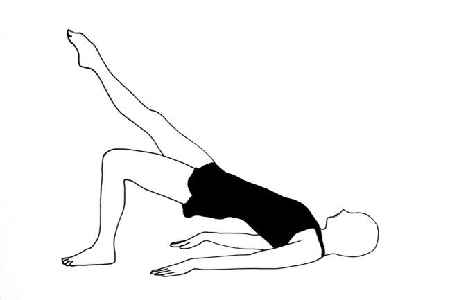 Połóż się na plecach z nogami ugiętymi w kolanach, ramiona wzdłuż tułowia. Z wdechem unieś biodra w górę, napinając brzuch i pośladki. Wykonaj wydech, unosząc prawą nogę, tak aby stała się przedłużeniem tułowia. Po 10 powtórzeniach opuść biodra na podłogę i to samo ćwiczenie wykonaj drugą nogą.